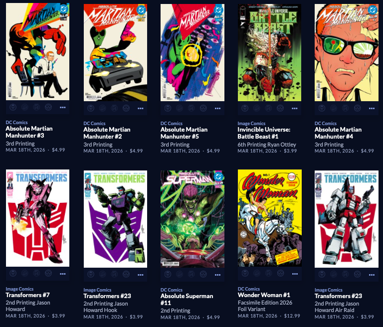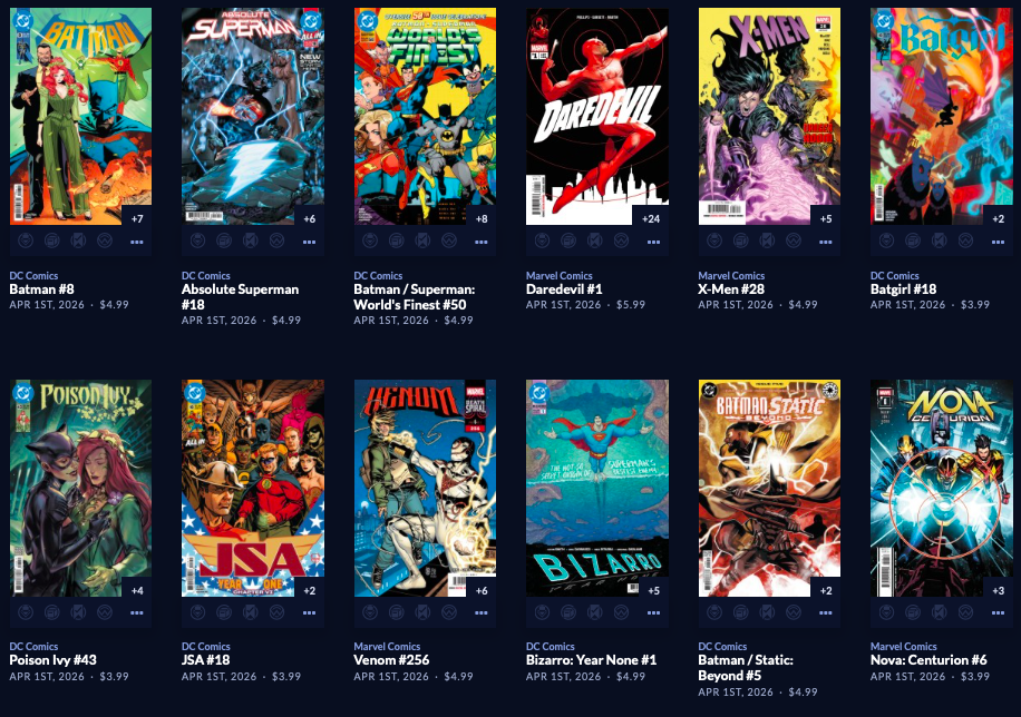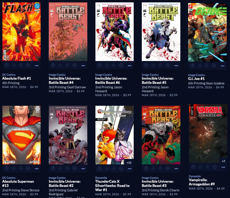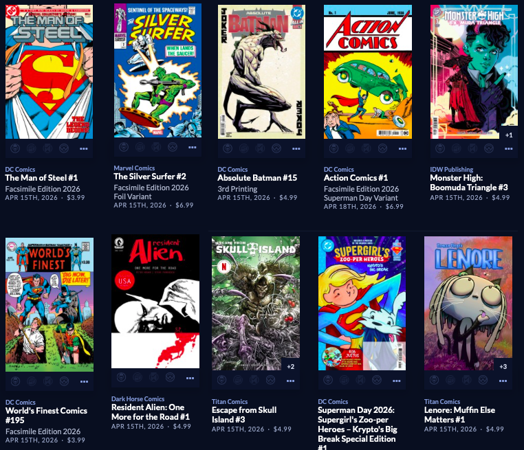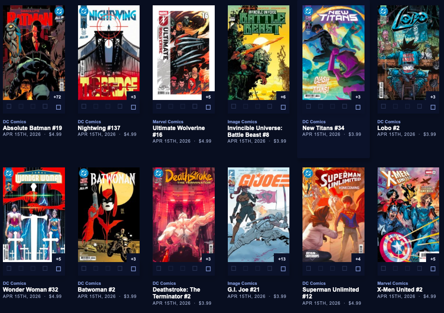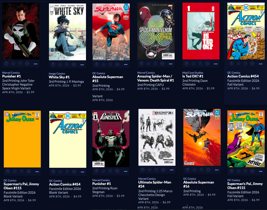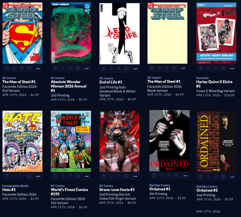 Large week, with back up to  212 facings. Absolute Batman #19 is here along with a reprint of the popular Annual from last year, along with a big week of 64 new this week, AND a couple dozen Superman Day (this Saturday 4/18) comics and other items, both FREE and NOT FREE.  Marvel is the smallest segment this week, with Image and the Other Guys shipping in 110 covers! Hope that does it for you. It does it for me!